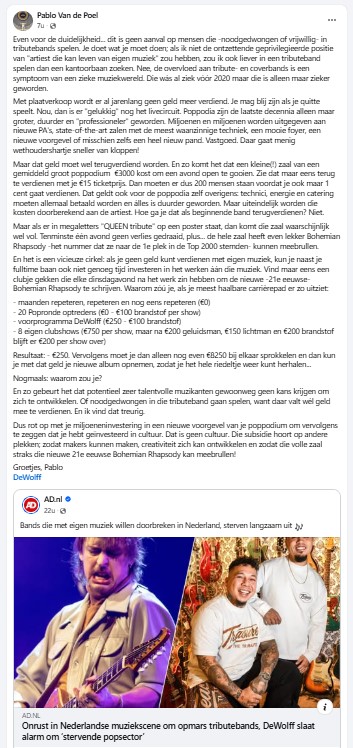 Afgelopen weekend brak Pablo van de Poel, gitarist-zanger van DeWolff, in het AD een lans voor de bands die eigen muziek maken en vraagt gemeentes en andere overheden meer oog te hebben voor financiering van de muziek zelf in plaats van alleen een mooi gebouw met een dure P.A. neer te zetten. In een eigen social post wil hij zijn uitingen in het AD verder toelichten.